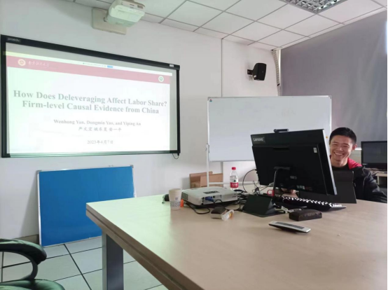 2023年4月7日中午,豪门国际官网 举办“支部之家·财税教研论坛”(第二期),税务系教师赵焱博士在公共财政研究中心作了题为“How Does Deleveraging Affect Labor Share? Firm-level Causal Evidence from China”(《去杠杆是如何影响劳动收入份额的——来自中国企业层面的因果证据》)的学术报告。论坛由叶兵老师主持,部分师生参加本次讲座。