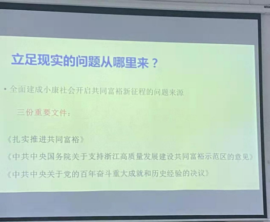 在了解现实情况的基础上,注重挖掘科学问题,形成研究内容。以“全面建成小康社会开启共同富裕新征程的问题来源”为例,可以深度解读《扎实推进共同富裕》《中共中央国务院关于支持浙江高质量发展建设共同富裕示范区的意见》《中共中央关于党的百年奋斗重大成就和历史经验的决议》等重要文件,并注重研读与本研究内容相关的附属资料和具体执行文件,在日常中重点关注习近平同志的系列讲话。李永友教授同时建议大家要关注时事政治,深入研读领域内的文件、政策。最后,李教授就具体选题与师生们进行交流探讨。
