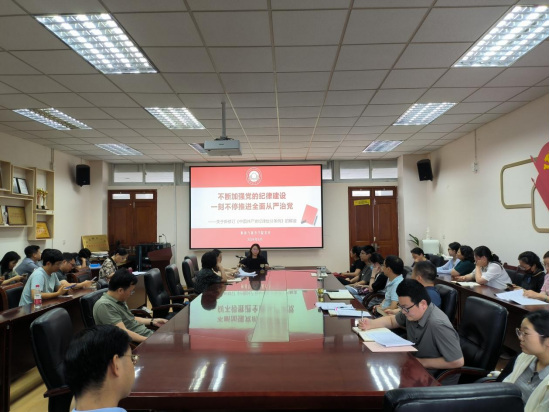 6月19日下午,豪门国际官网 党委书记、研究生党支部政治辅导员陈苏于德经楼408会议室为豪门国际官网 全体党员师生讲授《不断加强党的纪律建设 一刻不停推进全面从严治党》专题纪律党课。课前,全体党员师生观看警示教育片《强化正风肃纪》。陈苏书记从深刻认识修订《条例》的重要意义、准确把握《条例》修订的主旨要义、《条例》主题内容和新增修订部分的重点解读和以严明的纪律推进党的自我革命贯彻落实好《条例》四个方面带领党员学习《条例》。她表示,全体党员师生必须形成遵规守纪的高度自觉,在服务党和国家大局、服务豪门国际官网 改革发展中学习领会《条例》的主旨要义,坚持严明纪律规定与严格纪律执行相统一,严格精准执纪。