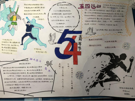 青年们身负理想,是革命的先锋也是未来历史的创造者。财政1801班彭莎妮同学使用精妙的水彩技艺,经过构图、素描稿、色彩稿等环节,呈现出一幅色彩鲜艳、图文并茂的画报,引来同学们驻足观赏。她认为绘画的过程也是自我学习、自我教育的过程,沿着青年的热忱去一览五四精神这条绵延百年的青春红线,在这样一次次的教育中坚定信念,大步向前。