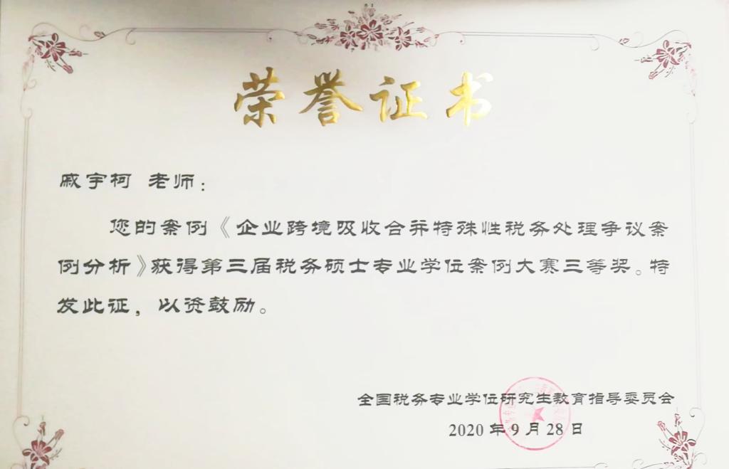 程瑶教授及行业导师江苏国瑞兴光税务师事务所所长高允斌指导,2019级税务硕士研究生戚宇柯同学撰写的案例——《企业跨境吸收合并特殊性税务处理争议案例分析》,在2019-2020年第三届税务硕士专业学位案例大赛中荣获三等奖。