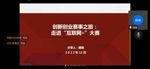 第九届“互联网+”大学生创新创业大赛暨省赛选拔赛备赛准备工作,加强师生联动,强化创新创业能力训练,增强高校学生的创新能力和在创新基础上的创业能力,培养国家建设需要的适应性创新型高水平人才。12月6日下午2点我院举办了“互联网+”创新创业专题线上讲座。本次活动邀请了南京大学路端老师为大家讲解,并给予同学们关于创赛方面的建议。讲座由豪门国际官网