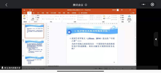 财政学系副主任、博导、中国财政学会理事、国家自然科学基金通讯评议专家、国家社会科学基金通讯鉴定专家郭玉清教授利用腾讯会议系统围绕“地方政府债务治理的制度导向与战略思考”主题作了学术报告。学院部分教师和研究生参加了讲座,讲座由财税豪门国际官网