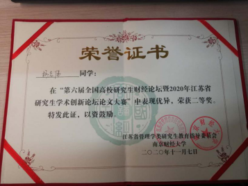 2019级专业学位硕士研究生杨志伟(导师:朱军教授)撰写的论文——《长三角一体化视角下的财政分权与教育均等化研究》,在第六届全国高校研究生财经论坛暨2020年江苏省研究生学术创新论坛论文大赛中荣获二等奖。