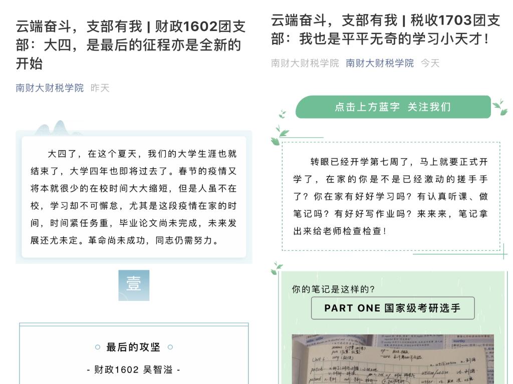 活动以每个支部一期微信公众号推送的形式开展,同学们有的在线展示“学霸”笔记,有的传授上网课的经验和线上学习“小妙招”,也有毕业班支部在线交流“网面”经验和考研复试的备战方法。同学们笑着“吐槽”网课的各种趣闻现象,同时也自豪地喊出“我们也是平平无奇的学习小天才”,“希望老师快快检查一下我们的学习笔记”。