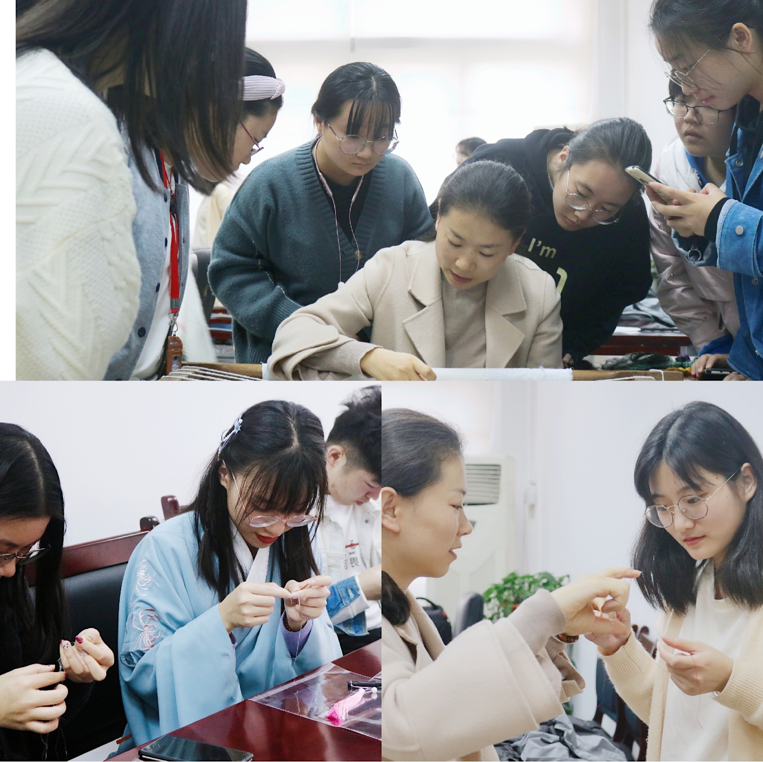 李欣芮同学与现场的师生分享了自己从单纯对苏绣感兴趣到投入其中发展为“志趣”的历程。随后,王安芬老师从底料、底稿、花线、上绷、劈线、刺绣一一进行现场实物展示和技法教学。短短的时间内,王老师教授了,齐针、斜平针、滚针、三角针,套针,打籽绣等多种针法,力求能在最短的时间内,让同学们更多的了解苏绣技法。