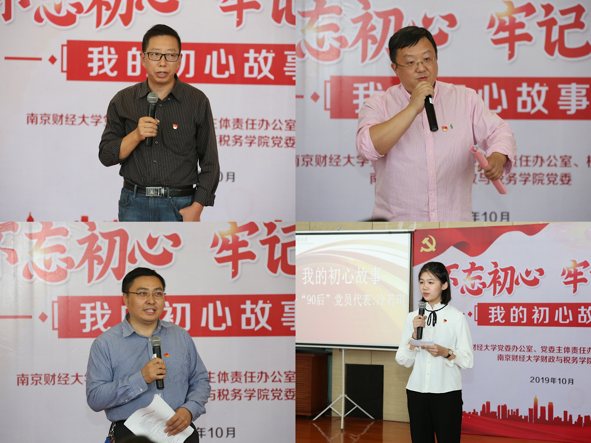 此次分享会分别邀请了“60后”、“70后”、“80后”、“90后”四位党员师生代表讲述自己的初心故事。他们当中有坚守在教书育人一线30年的陶学荣老师,有南财大第一批建设者孙彬主任,有身兼教学科研管理多职的朱军院长,也有平均学分4.4、始终保持专业第一的在校生党员冷若琪。他们成长于不同的时代,奋斗在不同的岗位,却坚守着同一份初心。拥有30年教龄深受学生爱戴的陶学荣老师说:“我的承诺很简单,爱岗敬业,教书育人。这是教师家庭出身的我从小耳濡目染的承诺,也是我坚守了30年的初心。”“90后”党员代表冷若琪同学说到动情之处泪眼婆娑,她说“这是我原本准备好的稿子,但今天现场听到了几位老师的初心与承诺生发出了更多的感慨也特别感动,我们现在生活在如此美好的时代,是他们,是一代又一代的奋斗者为我们创造的,作为大学生我们真的要不惰寸功,用奋斗换取更多人的幸福。”随后财税豪门国际官网