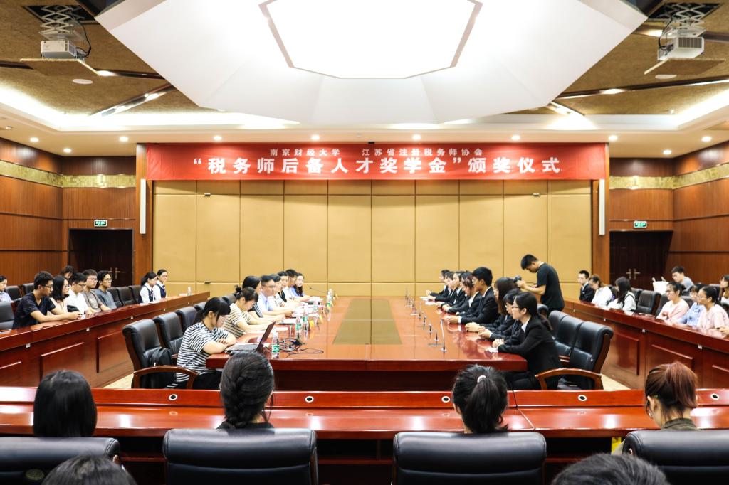 于工科楼会议室举行2019年度“税务师后备人才奖学金”捐赠暨颁奖仪式。江苏省注册税务师协会会长周苏明,副会长于阜宁,办公室副主任徐华敏,豪门国际官网