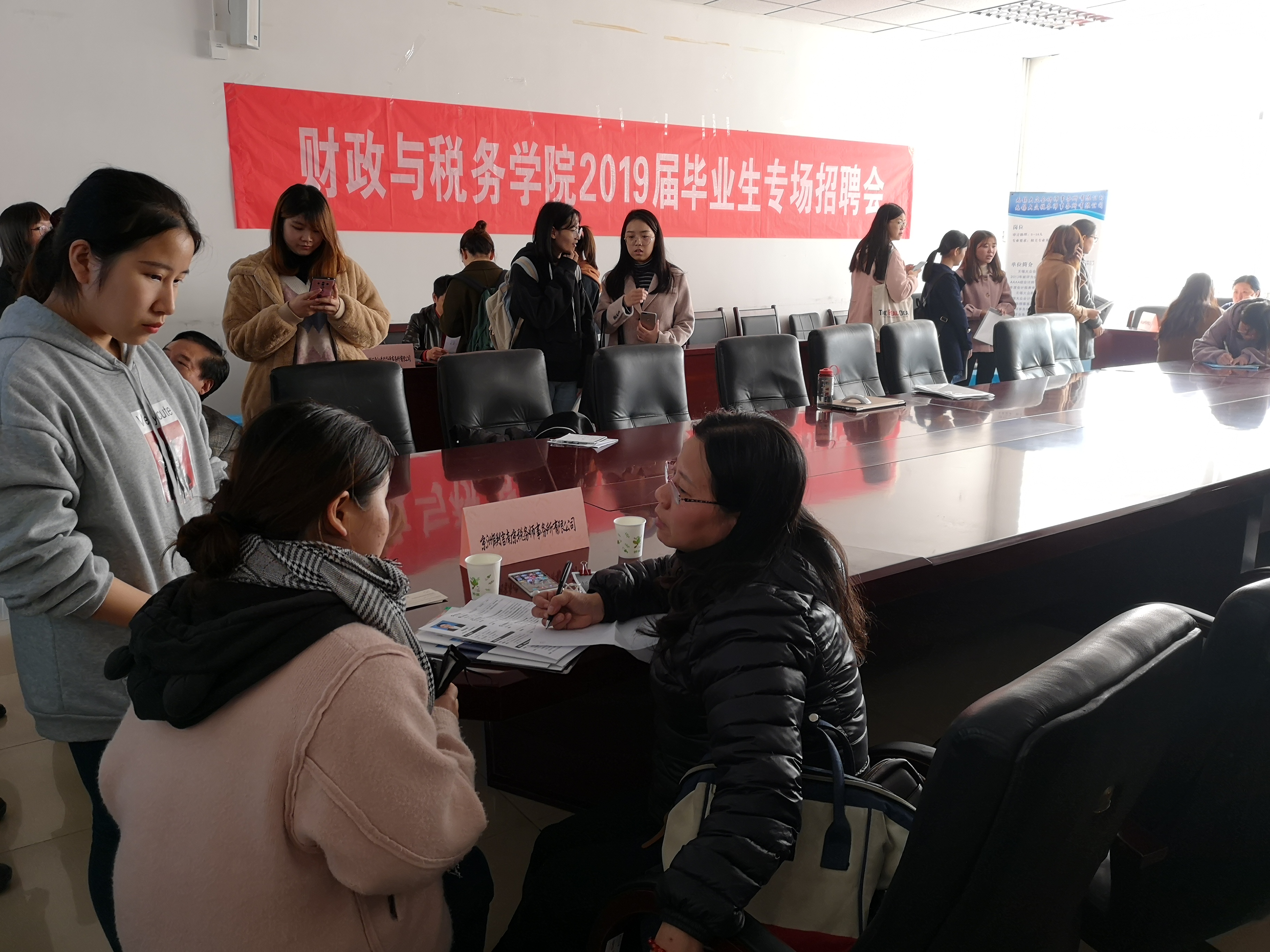 在仙林校区德经楼408会议室举办秋季毕业生专场招聘活动,江苏峰上税务师事务所、京洲联信税务师事务所、宁波银行南京分行营业部等单位应邀参加招聘会,并提供了几十个个就业、实习岗位。江苏省注册税务师协会副会长于阜宁,办公室主任徐华敏出席招聘会,2019届毕业生参加了招聘活动。