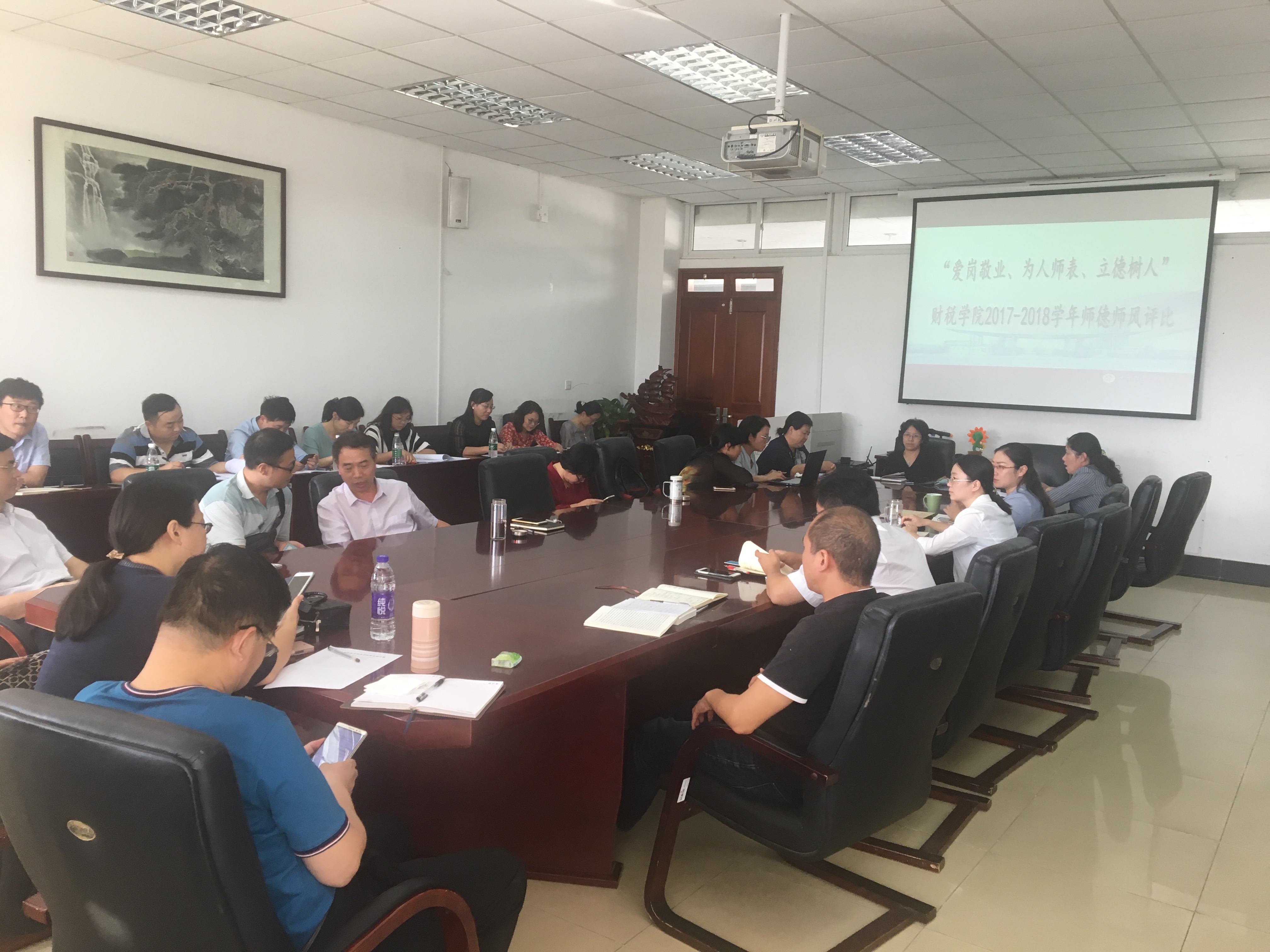 于德经楼408会议室举行了2017-2018学年“爱岗敬业、为人师表、立德树人”评比,全体教职工参加了活动。此次活动旨在激励全院教职工增强为人师表、立德树人、敬业爱岗、以生为本的责任感和主人翁意识,进一步弘扬师德风范,营造以德育人、以德修身、争当师德先进的良好氛围。