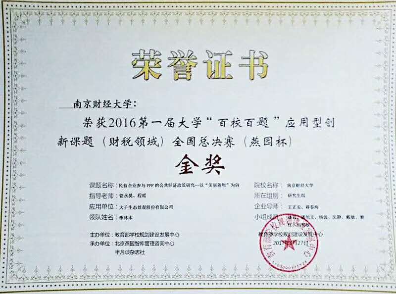参赛课题《民营企业参与PPP的公共经济政策研究——以“美丽蒋坝”为例》脱颖而出,摘得研究生组金奖桂冠(名单附后)。