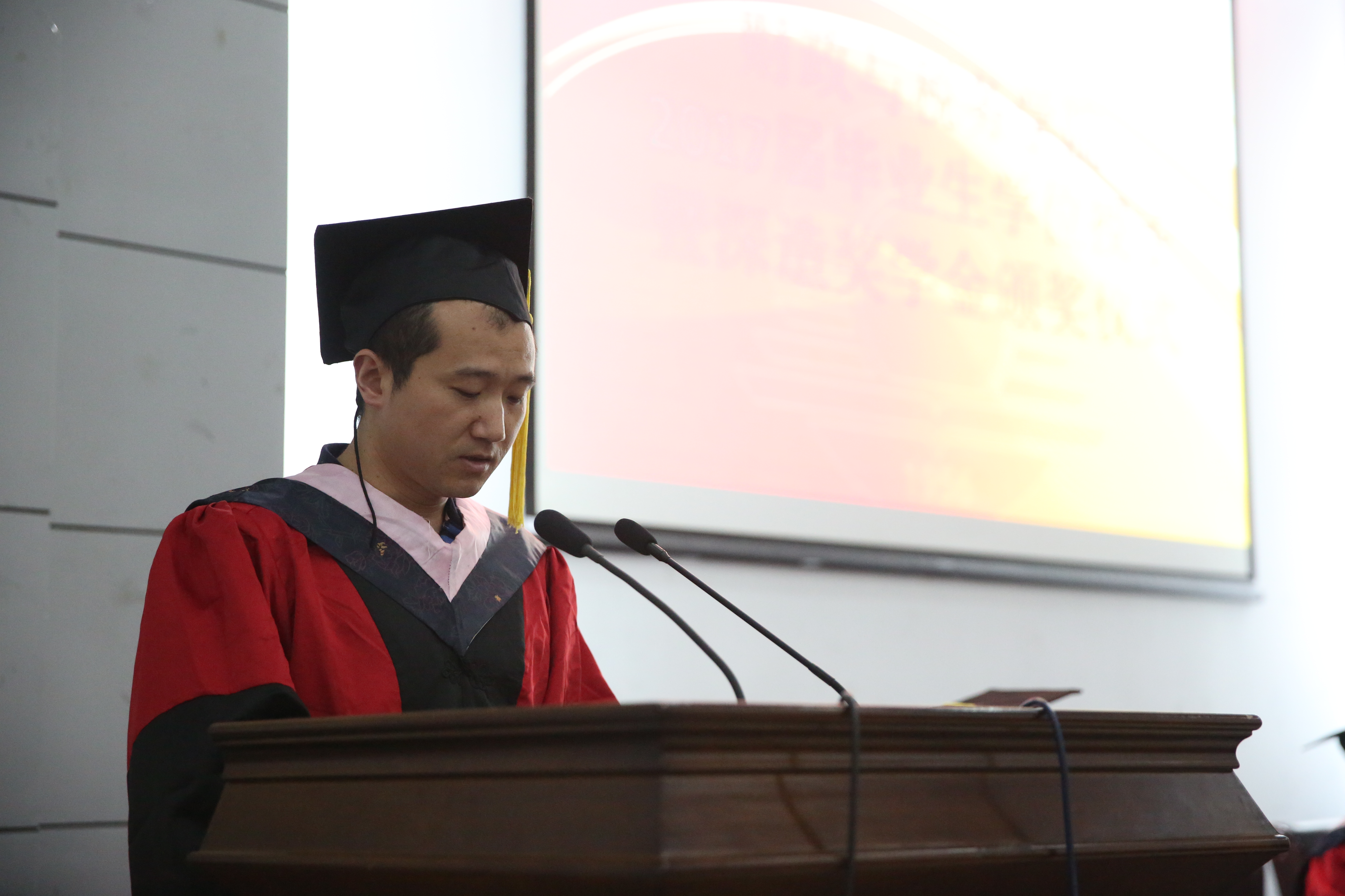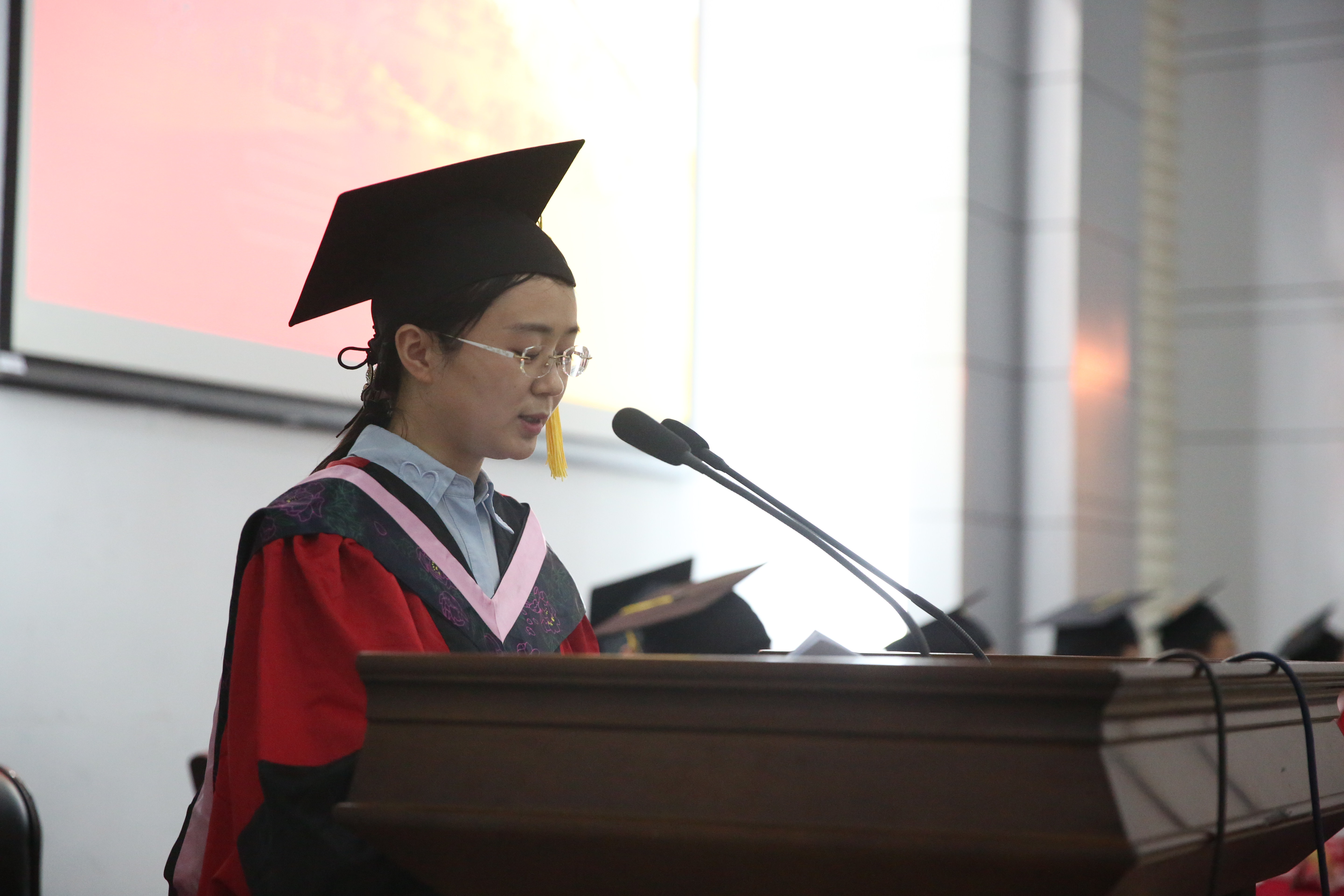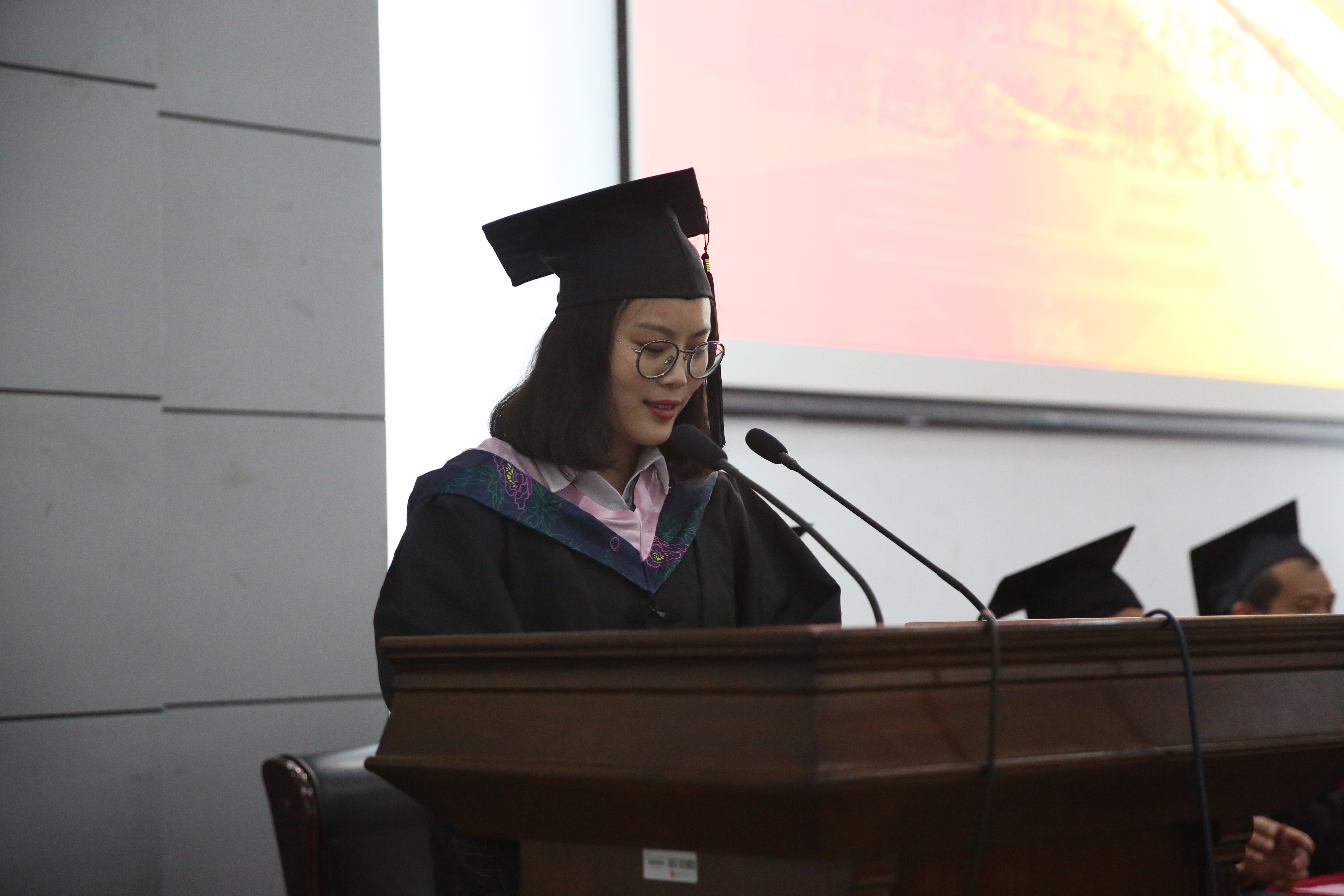 领导、教授为他们一一拨过学位帽上的流苏,授予学位证书。接着,优秀毕业生代表沈静同学代表发言,她表达了对母校的感恩,对同窗情的眷恋,同时也表示无论今后身处何处,一定不辜负母校的希望,积极进取,不懈追求,描绘出更加绚丽的人生画卷,为母校争光。