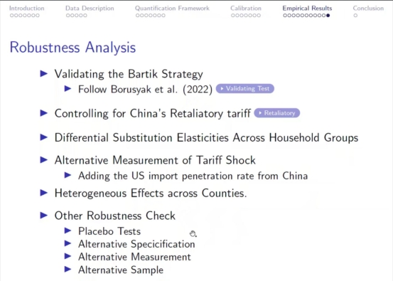 马弘教授首先从时间角度对近20年美国对中国加征关税的现象和特点进行了介绍,提出关税的加征对美国消费者带来了不利的影响,介绍了消费品的分类分析富人和穷人在消费品选择上的差异,通过相关消费者数据的回归统计,分析了为何越富有的群体受到关税加征的影响越小。